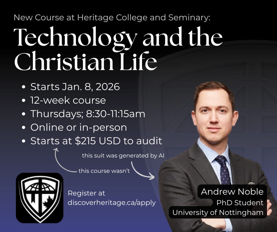 In January 2026, I will be teaching a twelve-week course at Heritage College and Seminary called Technology and the Christian Life.